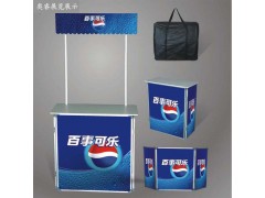 促销台又名:促销桌、铝合金促销台、PVC促销台、PS促销台、弧形促销台、半圆形促销台、拉网式促销台、拉网接待台、铁框促销台。